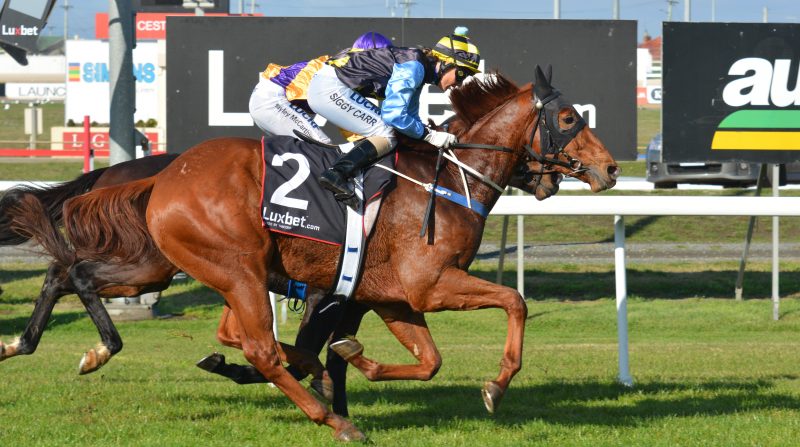 Laughing Heir (Siggy Carr) gets up to defeat Zero Point at the Luxbet Racing Cebntre in Launceston on Sunday. icon Click to enlarge