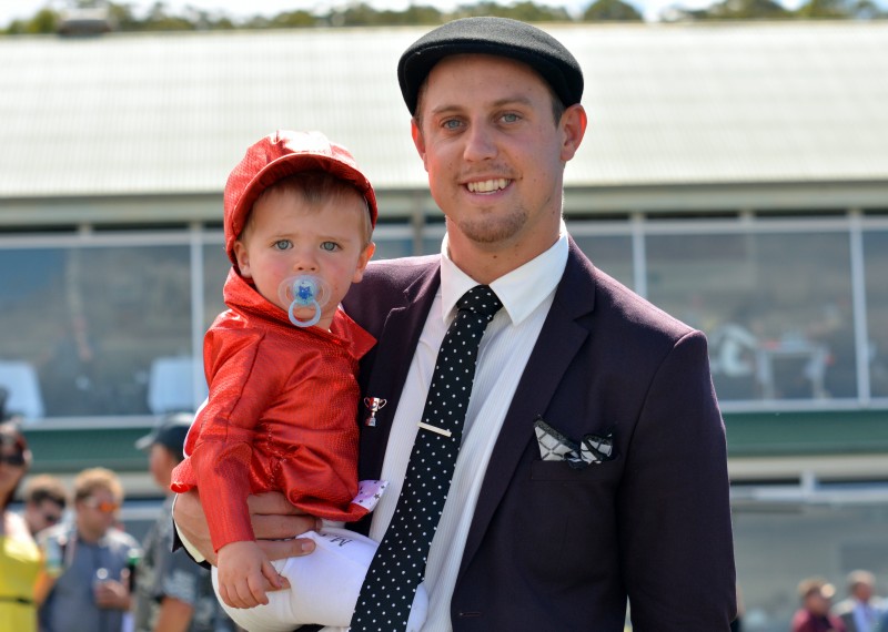 Murphy Wiseman dressed as a jockey with his uncle Oliver Wiseman at the Devonport Cup yesterday. Little Murphy was an entrant in the fashions on the Field.